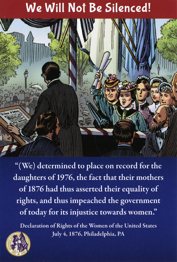 On July 4, 1876, one hundred years after the United States of America declared its independence from Great Britain, more than half the population could still not vote in a federal election. White male landowners had the vote from the beginning of the country. In 1870 the Constitution granted black men the right to vote. But all women were still denied voting rights.At the great centennial celebration of the USA in Philadelphia, the National Woman Suffrage Association was denied the right to speak. So Susan B. Anthony, Matilda Joslyn Gage, Sara Andrews Spencer, Lillie Devereux Blake, and Phoebe W. Couzins stormed the podium during the proceedings to present the Declaration of the Rights of Women of the United States. The women were shooed from the stage. Another fifty-five years passed before women in the USA could vote in federal elections.