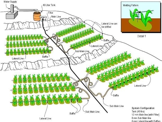 The good news is that affordable small farm systems are already available through the work of IDE. Through the work of IDE, the market price of drip irrigation has been drastically reduced by using comparatively thin walled lay-flat hose to convey irrigation water from sources like tube-wells to rows of plants. The cost of drip irrigation systems were reduced by designing affordable filters to remove dirt from the water, reducing system pressure to reduce the wall thickness of supply and lateral tubing bringing water to each plant, and simplifying the design of the emitters, or drip points, along each lateral. This reduced the cost of drip irrigation systems from about $1,200, or more to less than $600 per acre.