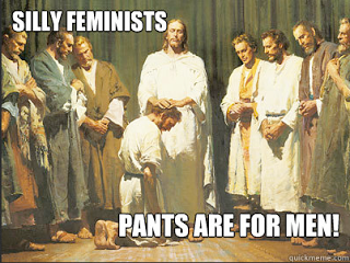 Maybe other people might say it differently, and even I might say it differently on a different day, but the fact remains that the status quo of what women should and should not wear to show respect when they worship is decided by men. And that, I think, is the point of Wear Your Pants to Church Day. There are women who care that their respectability and acceptability before God is based on standards of appearance decreed by male leadership,and not female leadership.