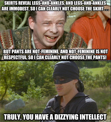 All that said, I’m fine wearing a skirt to church if it makes everyone around me more comfortable. No biggie. It’s not asking a lot, and if I really cared I would wear pants and let the blowback move past me without giving it much thought.