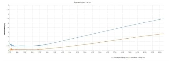 Testing 15 & 20 Stop ND filters was not as straightforward as we wanted. Because they are so dark, the spectrometry machines do not have enough power to measure them as a single filter. So we had to create single sided filters during the same process of making a double sided ND filter. Suffice it to say, we broke it up into 2 halves instead of one filter. For the 15 Stop filter, we really tested one side at 7.5 stops, and for the 20 Stop, we tested one side at 10 Stops.