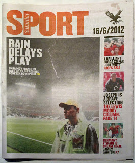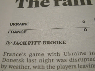 I was slightly surprised to see that the cover story for the Sport section wasn't England's dramatic 3-2 victory over Sweden but the fact that rain had delayed the France-Ukraine tie from earlier the same day.