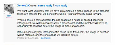 When they receive a takedown notice Flickr are obliged to respond. They are obliged to remove the photo from view. What they're not obliged to do is delete the page it lives on, delete all the comments left on it and render any links pointing to it useless. But that's what they were doing. For reasons they were unprepared to discuss.