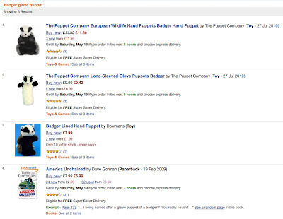 At the time of writing, this is what you see if you search amazon.co.uk for the words badger glove puppet. One of my books - America Unchained - turns up as the fourth search result. I have no idea why.