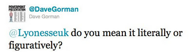 Actually this isn't always phrased as a question. A sample tweet. "I went to see Dave Gorman's Powerpoint Presentation tonight. Very funny. But it wasn't PowerPoint. It was Keynote. I'll let him off." I know it's hard to believe that people do this... but they genuinely do. At least two every night. And they're wrong... it is PowerPoint. I've had a couple of twitter conversations about it and the reason behind it seems to be that a) I'm running it on a Mac and b) "PowerPoint can't do that and Keynote is better so you should use Keynote". But PowerPoint can do that. Because that's what did that. That thing you saw that you thought PowerPoint couldn't do. Besides... the show isn't about PowerPoint... it just uses it. It wouldn't be funnier if I used different transitions...