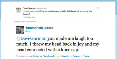 I was curious. How do you accidentally headbutt someone in a theatre? I assumed he meant it was some kind of reaching-across-the-bar-during-the-interval accident rather than a during-the-show-and-sitting-in-your-seat kind of thing... so I asked. And this was the answer: