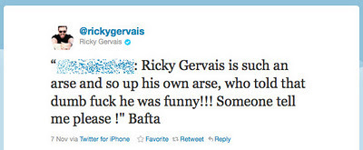 For those unfamiliar with the grammar of Twitter, the abusive 'who-told-him-he-was-funny' post came from someone else (I've filtered their username because I don't want to encourage any pitchfork wielding mobs) and Ricky has retweeted it - ie sent it out to all his followers - with the added retort, Bafta.