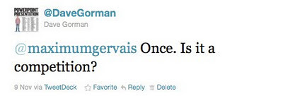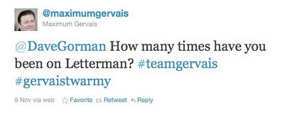 In fact it's exactly the sort of thing a Ricky Gervais superfan would tweet. Except that MaximumGervais replied saying: