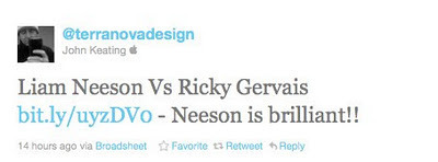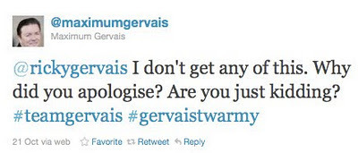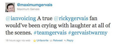 And this is where MaximumGervais tipped up. They too must have been searching for comments relating to Ricky - and they must have been following all sorts of threads because my tweet doesn't even mention any obviously searchable terms - but they tweeted me the following:
