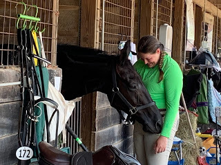 He was so lovely. He took in the golf carts and commotion and strange stalls. He didn't spook in dressage. In show jumping he refused one fence when my daughter got discombobulated, but he jumped it willingly on the second try.