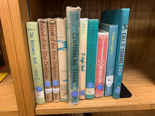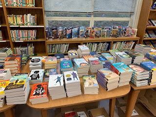 It was so much fun watching them chose. The photograph above is the big chapter books, but we had shorter chapter books, graphic novels, picture books, and lots of nonfiction. One child gleefully scooped up three books about planets. One black girl saw the book Don't Touch My Hair and said, "Oh, uh-HUH." Kid after kid after kid would select their books, sit down on the library floor, and start reading right away. (I wanted to take photos, but I don't share identifiable photos of children.) When the teachers came after school, to pick out books for their own classroom libraries, several of them reported that they'd given in to student demands and spent the entire afternoon reading.