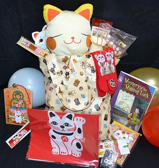 Usually, when I have a new book published, I celebrate with a launch event at a library, book store, or other physical venue. This time, I'm trying something new –a virtual book tour, online book give-a-ways, and a special Missing Luck – Lucky Cat contest. The prize is a Lucky Cat bag full of unique Maneki Neko (beckoning cat) items from Japan (including a cute plush beckoning cat, a wooden prayer plaque from Gotokuji Temple where the first Maneki Neko originated, tabi socks, hashi/chopsticks, stickers, candy, charm, etc. as well as a signed copy of my new book). Anyone can enter the Missing Luck – Lucky Cat contest here on my blog or on Facebook. All you