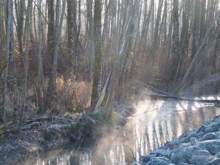 Mist rose up from the water, and rays from the low sun slanted through the trees.