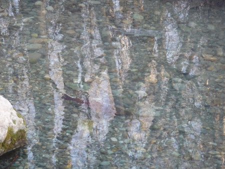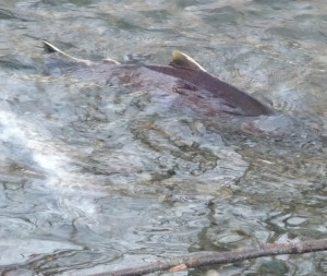 Further along, the red fin of a male salmon shark-tailed above the water as he splashed upstream.