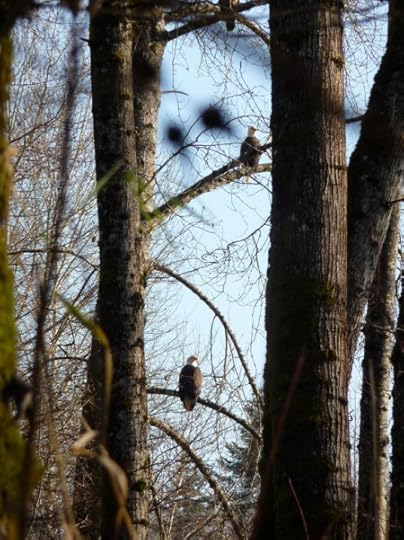 Beyond the creek, closer to the river, I caught sight of an eagle sitting on a branch, and then another. Counted seven sitting in the one tree. A few more in other trees.