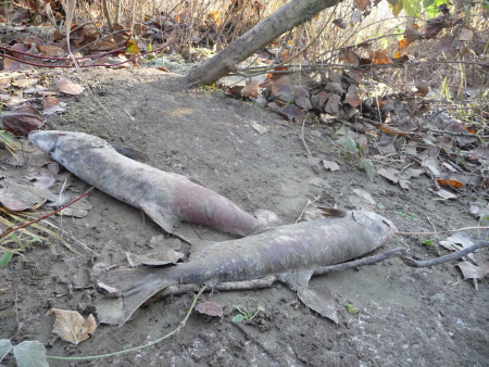 We walked along a dry stream bed to get closer, stepping over the decaying bodies of salmon that had swum upstream to spawn (in vain) weeks ago when the creek was full from the fall rain.