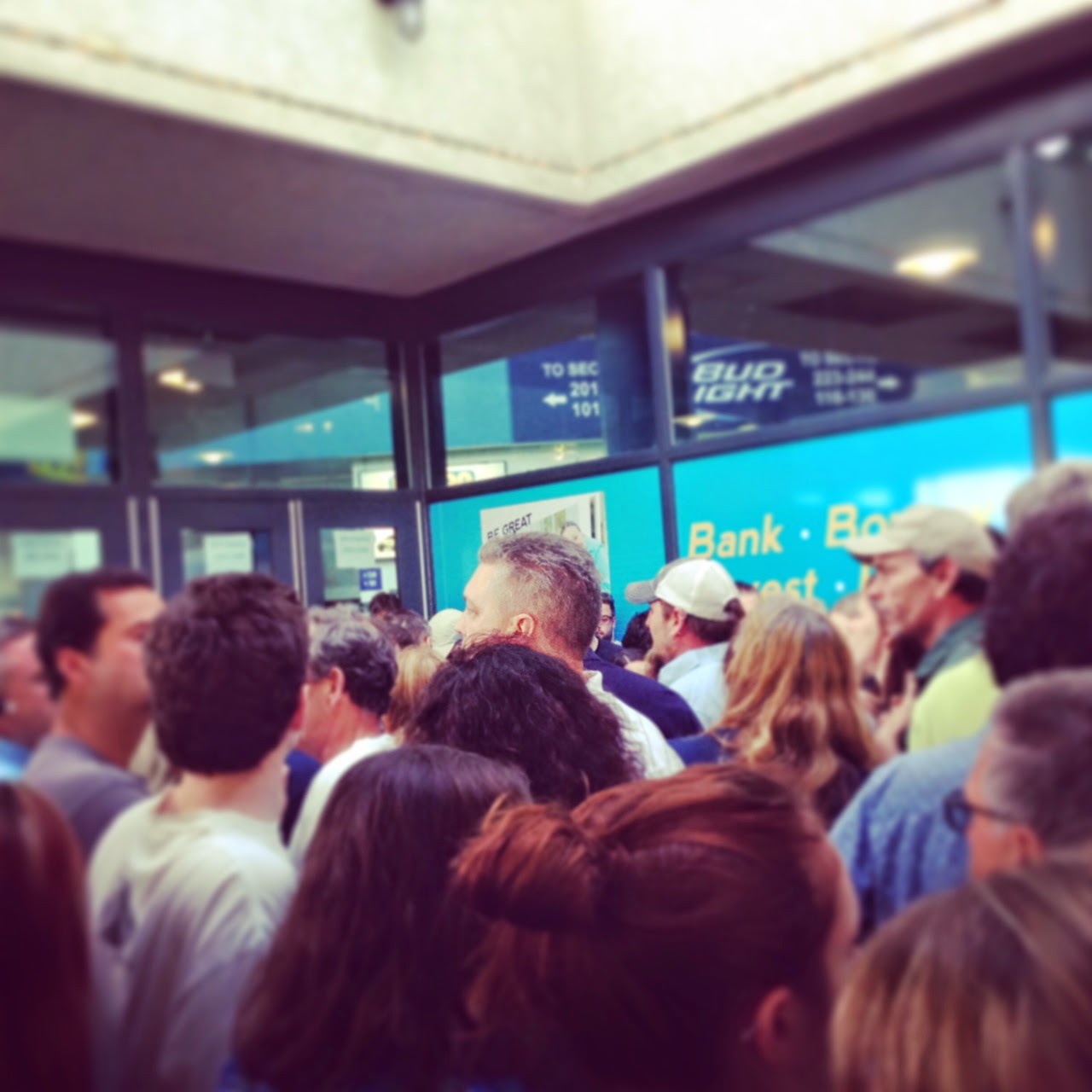 Springsteen NationAs I mentioned here, a big part of the concertgoing experience is the cameraderie of it all. You get to know a person really well when you road trip with them, or crash on their couch...or when you undergo the pit lottery with them. The lottery determines which holders of General Admission tickets get to spend the concert in the small area right in front of the stage. The pit lottery is a grueling experience. You get your wristband early in the day. Then you kill a few hours and come back, packing into a sardine-like line, and wait for a number to be pulled out of a hat.