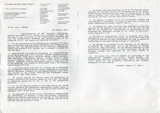 During this period PEN through its partnership with UNESCO convened writers in the Middle East and also writers in the Balkans to find common ground and to search out the pylons upon which bridges might be built and to monitor the situation for the writers in the regions. However, because of the Balkan War, it wasn’t possible to hold the meeting with the Yugoslav Centers in Bled as the Slovene Center had proposed. Instead PEN International President György Konrád hosted the gathering in Budapest and followed up with a meeting of South-Eastern European centers in Ohrid, hosted by Macedonian PEN though the Croatian Center wasn’t able to attend. The discussion included the desirability of recognizing the right of conscious objection in time of civil war and the possibility of solving the problem of minorities by allowing multiple citizenship.