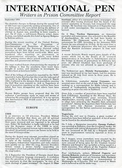 PEN International’s Writers in Prison Committee Report, September 1991 presented to the November 1991 PEN Congress in Vienna. PEN’s complete Case List for this period included 143 pages of cases of writers and journalists around the world reported kidnapped, “disappeared,” executed, having died in custody, imprisoned, banned, under house or town arrest, deported or awaiting trial.