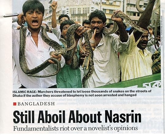 In Bangladesh novelist Taslima Nasrin was in hiding. Death threats had been issued, a price put on her life. On the streets of Dhaka and other cities, crowds threatened to hang her because of her words in a newspaper challenging the Koran and Islamic laws and because of her novel Lajja (Shame) which depicted Muslim atrocities on Hindus after a mosque’s destruction in Ayodhya, India.