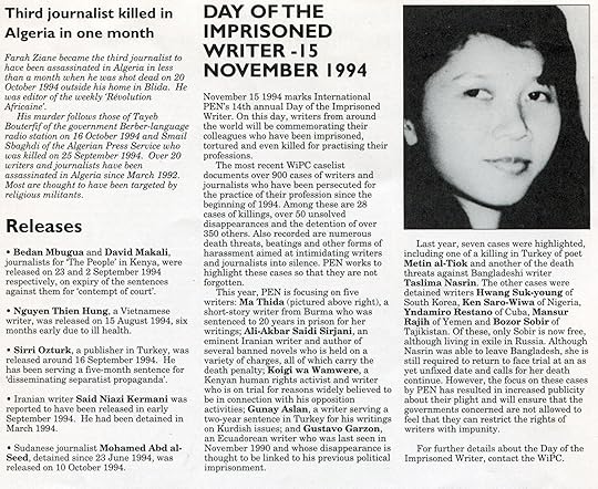 The Chair’s report for 1994 notes progress but also shows how little has changed for writers in the past 25 years in many areas of the world such as Turkey and China though there has been progress in Algeria, Rwanda, the Balkans, Nigeria and Kenya. The Day of the Imprisoned Writer campaign in November, 1994, noted in the newsletter above, focused on five writers. Of these Ma Thida was released and eventually started a Myanmar/Burma PEN Center and now serves on the PEN International Board; Koigi wa Wamwere was released and is a celebrated Kenyan writer. Gunay Aslan and Gustavo Garzon, also released, continue to create. Ali-Akbar Sa’idi Sirjani died in Iranian prison under mysterious circumstances in November 25, 1994.