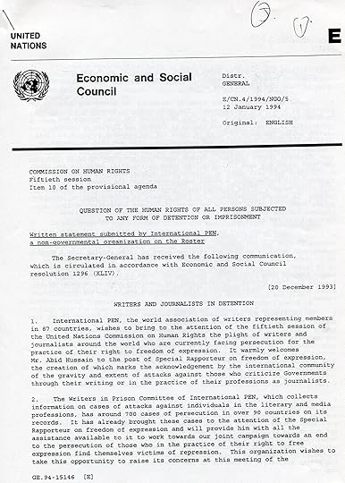 The week before, U.S. Secretary of State Warren Christopher had visited the same embassy. The United Nations Human Rights Commission was meeting in Geneva, and PEN, which had consultative status at the U.N., had sent us as representatives to the Commission meetings with targeted cases and country reports, including one on North Korea. The year 1994 was a time of potential thawing in relations with North Korea, and the diplomats on the other side of the table were telling us how they would like to have a PEN Center in North Korea.
