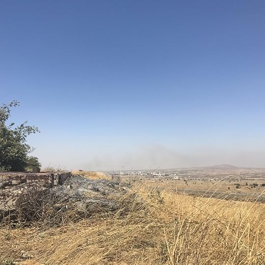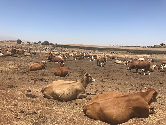 On the Golan Heights in the hills separating Syria and Israel fields of cows graze and sleep, swishing their tails, whisking off flies. Many of the cows lying in the fields appear to be waiting and contemplating as cows do. The cows are a source of milk and of meat and income for a kibbutz nearby. Among the cows wander white dogs. It is a peaceful scene except for the distant thudding and booming of the war in Syria just a mile away.
