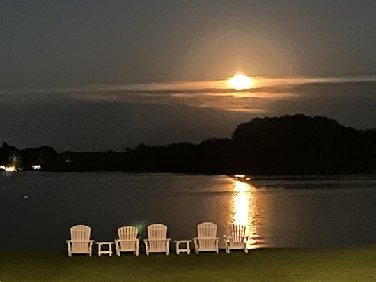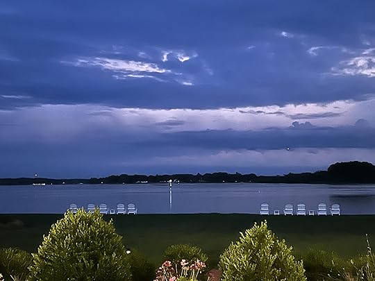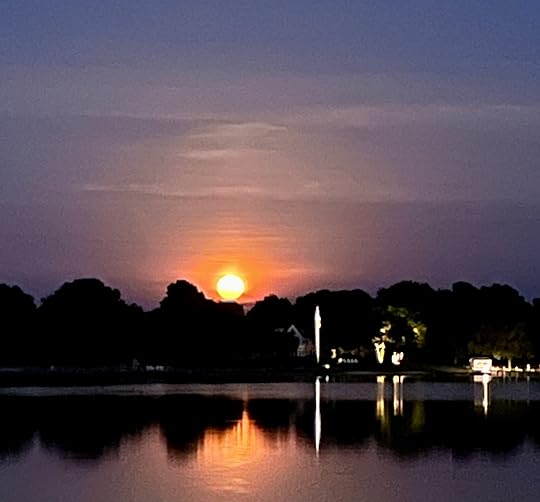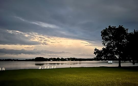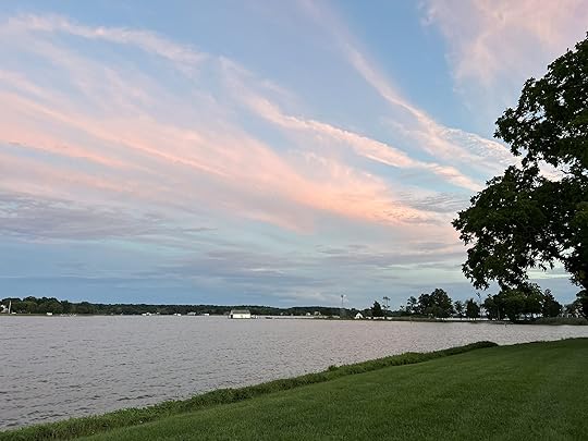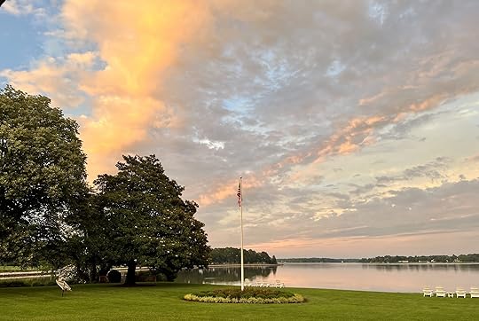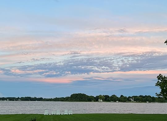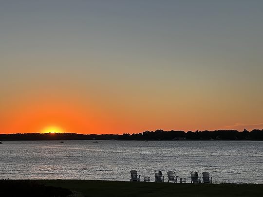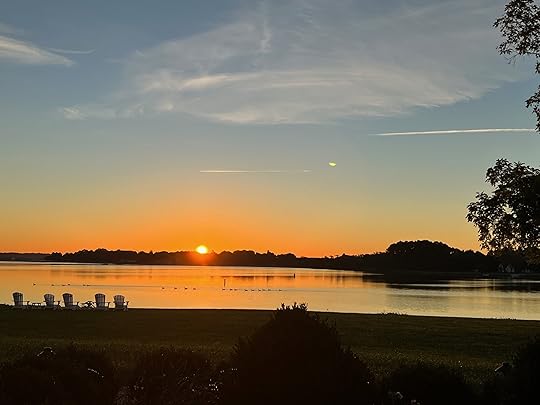 The clouds have finally lifted after days of grey and rainy skies. The sun is rising in all its quiet splendor. I can see light hovering at the horizon on the far shore this early morning.