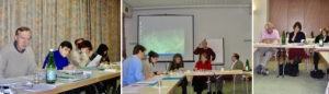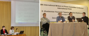 Left: Writers in Prison Committee (WiPC) meeting at Berlin Congress. Karin Clark (Chair WiPC) and Sara Whyatt (WiPC Program Director). Right: WiPC Conference in Istanbul: Eugene Schoulgin (Norwegian PEN/PEN Board), Jens Lohman (Danish PEN), Jonathan Heawood (English PEN), Notetaker