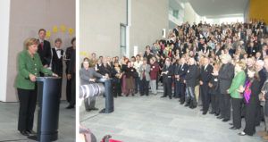 Left: German Chancellor Angela Merkel addressing PEN members at 72nd PEN Congress, 2006; Right: PEN International President Jiří Gruša speaking to PEN delegates and members at the Federal Chancellery; front row: German PEN President Johano Strasser, Chancellor Angela Merkel and PEN International Secretary Joanne Leedom-Ackerman. [Photo credit: Tran Vu]
