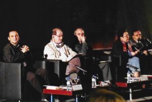 PEN Program at Cultural Forum Barcelona 2004. L to R: Carles Torner, International PEN Board Member and director for PEN conference, Salman Rushdie, President American PEN, Josep Bargalló, First Minister of Catalonia, Dolors Olier, President Catalan PEN