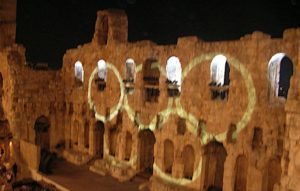 Olympic circles projected in light on the Acropolis at the 2004 Olympic Games in Athens