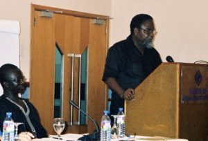 Speaking Ghanaian Professor and poet Kofi Anyidoho, seated Frankie Asare-Donkoh, Secretary PEN Ghana