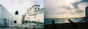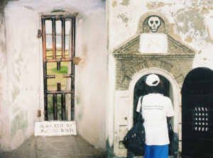 “Slave Exit to Waiting Boats” in Elmina Castle, Cape Coast, Ghana; Kadija George, President of African Writers Abroad Center standing in front of a “door of no return.” The back of her shirt reads: “Literature is the most beautiful of countries.”