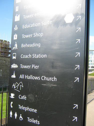 On Sunday, we went to visit the Tower of London. This is the info sign in the courtyard, which gives helpful directions to the phones, the buses, etc. But one thing on that sign is not like the others --