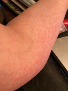 During the night, her skin became burning hot to the touch again and by morning, the rash was worse, covering her arms, her back, and her legs. Still, she didn’t have a fever. She called the clinic where she’d gone the day before and asked about her other Strep results. They told her the test came back negative. They told her to continue her meds and if matters became worse to come back or go to the ER. She stayed out from work a second day, drank lots of liquids, and took her prescribed medications. She spent the day resting.