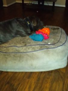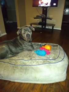 Because of a Cane Corso’s sharp teeth and incredibly strong jaws, there are few toys he’s not destroyed. Walmart sells little grunt pigs, so we took a chance he might not rip it apart. For some reason, he loved it. He played rough with the first one and it stopped grunting, so we bought another one. He kept it all the time and would ‘share’ it with us in the evenings. He placed it on the couch and nudged it with his nose for us to toss, so he could fetch it. Sometimes, however, he bit it and played tug instead. Due to his extremely sharp teeth and his iron grip, he ripped the pig’s snout.