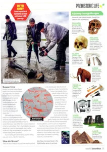 In the Mesolithic period, the whole of Europe was one vast forest, apart from the far north where it was too cold for trees to grow. People lived in small groups of between around15 and 100, either in one settlement or moving camp now and then. In spring, they might head up the rivers after salmon, catching them in nets of woven tree bark and smoking them to save for later. In summer, they might camp on the coast to fish, collect sea birds’ eggs and hunt seals and whales. In autumn, they might shelter from storms in the forest, gathering berries and nuts. They’d hunt many animals, including bear, boar, deer and horses. There are three main ways in which scientists can work out our ancestors’ diets. The first relates to evolutionary changes to brains and jaws. These suggest that, when compared to primates (the group of animals that includes apes and monkeys),humans have eaten meat for a long time. Measuring the chemical composition of prehistoric bones also suggests a heavy reliance on meat. Archaeological evidence (objects buried underground that reveal signs of past human life) is the third method but itis harder to analyse, mostly because plant material and meat rot away over time.