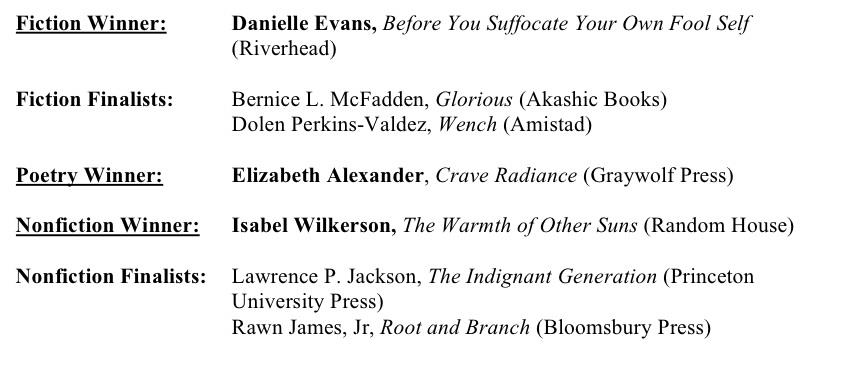 Unfortunately, due to poor ticket sales, The Hurston/Wright Legacy Award Ceremony has been cancelled. Here is a list of the winners/finalists: