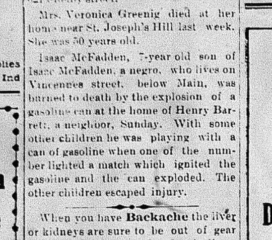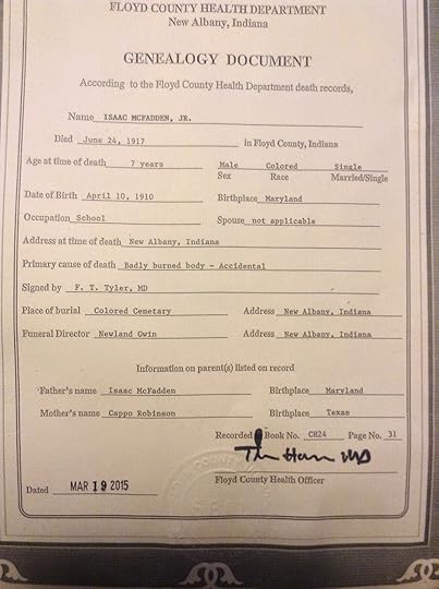A week or so ago, I was on Ancestry.com and stumbled upon an death entry for: Isaac jr. Mcfaddin in New Albany Indiana in 1917. The entry listed the child as seven years old.