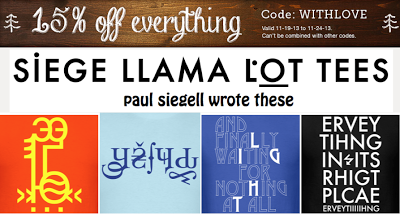 Siege Llama Lot Tees : Minimalist, concrete poetry t-shirts, lot lyric shirts and more from the books of Paul Siegell. Quality, customizable items for men, women, children, the office and bedroom - all at kind prices! (Hit me up if you have any requests!)