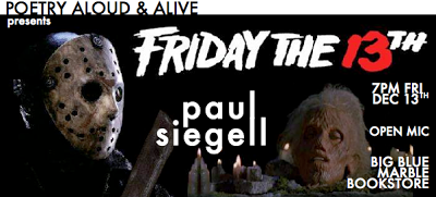 Coordinated by Dave Worrell and hosted by Mike Cohen at the Big Blue Marble Bookstore in Mt. Airy (Phila.), Poetry Aloud & Alive presents Paul Siegell, with OPEN MIC to follow. More info here. The horror.