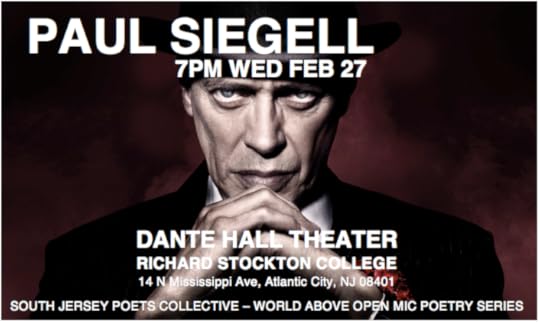 If YOU are IN or NEAR SOUTH JERSEY, I am reading in ATLANTIC CITY & SO CAN YOU! South Jersey Poets Collective presents "World Above: Paul Siegell" at Richard Stockton College's Dante Hall Theater (14 N Mississippi Ave, Atlantic City, NJ 08401). Facebook invite here!