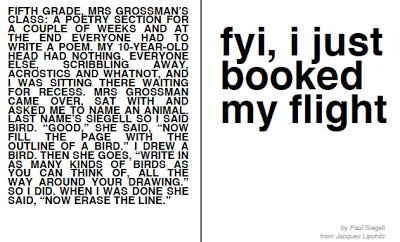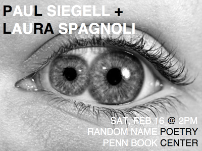 [02.16.13]: Penn Book Center’s Random Name poetry series presents Laura SPAGNOLI + Paul SIEGELL = Saturday, February 16 @ 2pm. Hosted by David Hancock. Facebook invite here. Come come! Aye aye!