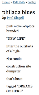 In April 2008, Paste had the good taste to interview Paul Siegell. "One can imagine Siegell's shaped verses singing from posters … like Pop Art glyphs," Jesse Jarnow wrote.