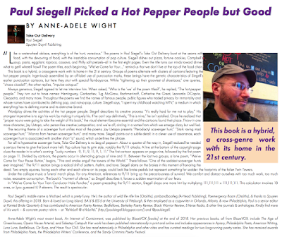 This book is a hybrid, a cross-genre work with its home in the 21st century. Groups of poems alternate with clusters of cartoons featuring the hot pepper people. Ingeniously assembled by an off-label use of punctuation marks, these beings have the genetic characteristics of Siegell’s earlier punctuation cartoons, but here they strut with special flamboyance. While “tightening up their grooviest of shoelaces,” one queries, “chaos cicada?”; the other replies, “impulse octopus!”