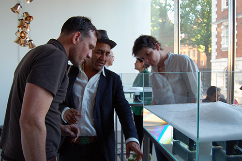 designer Sally Bannayi with artists Mike Iveson and Debra Welch at White Cube