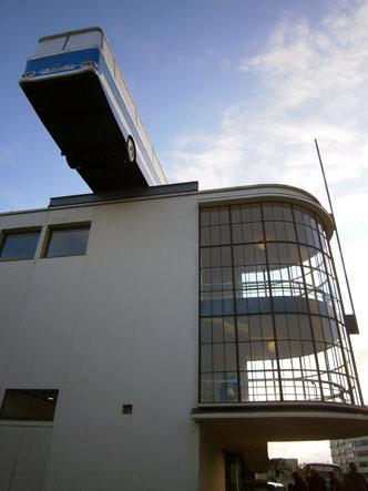 Like all group exhibitions, Red White and Blue: Pop Punk Politics Place could not show everything and one of the works that we would have liked to refer to was Richard Wilson’s Hang On A Minute Lads, I’ve Got A Great Idea. This brilliant work consisted of a life-sized coach teetering on the top of the iconic modernist masterpiece The De La Warr Pavilion at Bexhill on Sea. The piece references the final scene of the jingoistic Michael Caine film The Italian Job and was a key part of the Cultural Olympiad accompanying the 2012 Olympic Games in London. This project was referred to on the CHELSEA space News Blog in July 2012.