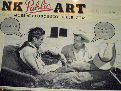 Following on from our mention of the movie The Italian Job, our friend, the founder and curator of CHELSEA cab and Cab Gallery, Jason Brown, recently sent us this photograph of the late James Dean in the American film Giant. In the mural the actor is shown with a speech bubble saying “Donald Judd” whilst his companion replies “never heard of ‘em”. The reference to a Minimalist artist by an actor playing a cowboy may seem incongruous but the link is that Giant was filmed in Marfa Texas where Judd was later to set up his Chinati Foundation, a series of studios and workshops, galleries, offices, and residential accommodation designed by Judd on a former American Airforce base. James Dean died in 1955 and the film was released posthumously in 1956. Donald Judd, who never liked the term Minimalism, died in 1994 but the Chinati Foundation continues his vision.