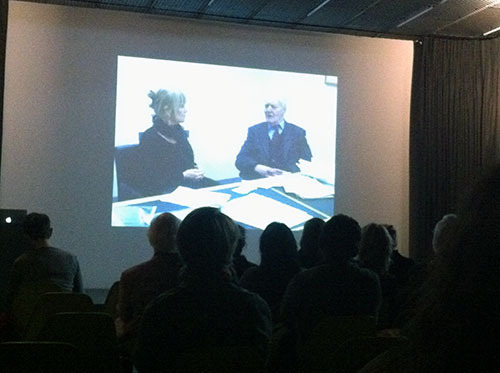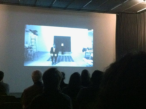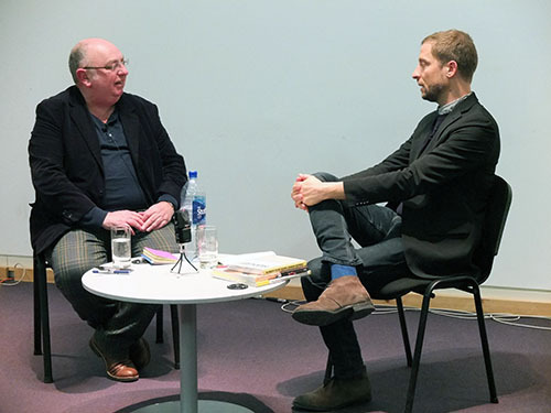 James Mackay and Stuart Comer talking Derek Jarman in the Lecture Theatre at Chelsea College of Art & Design